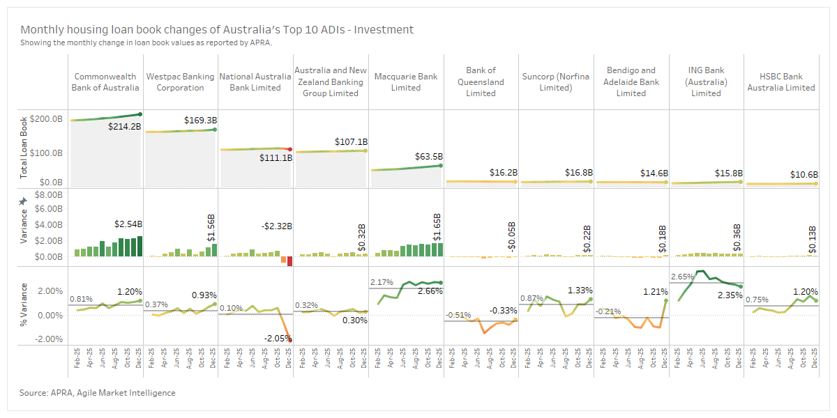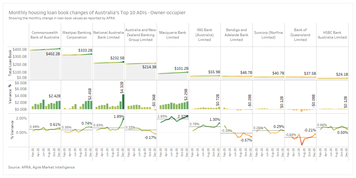The figures in this article were drawn by Agile Market Intelligence from APRA’s monthly ADI statistics to December 2025. The dataset covers total housing loans segmented into owner-occupied and investment housing loans across the ten largest lenders by mortgage loan book size. For this analysis, Agile plotted publicly available data to show movements in loan books and market share.