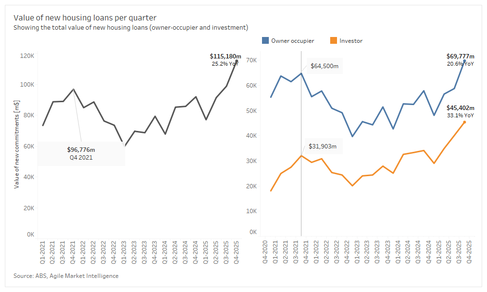 The value of new housing loan books reached a new record-high in December 2025. The previous highest record was in Q4 2021, with loan books valued at $96,776 million. This number was bested by the new Q4 2025 data showing that the value totalled $115,180 million, a 25.2% year-on-year (YoY) increase. Growth from both owner-occupier and investor loans drove these numbers. Owner-occupier loans totalled $69,777 million (20.6% YoY), while investor loans were valued at $45,402 million, boasting a steeper YoY growth rate (33.1%).