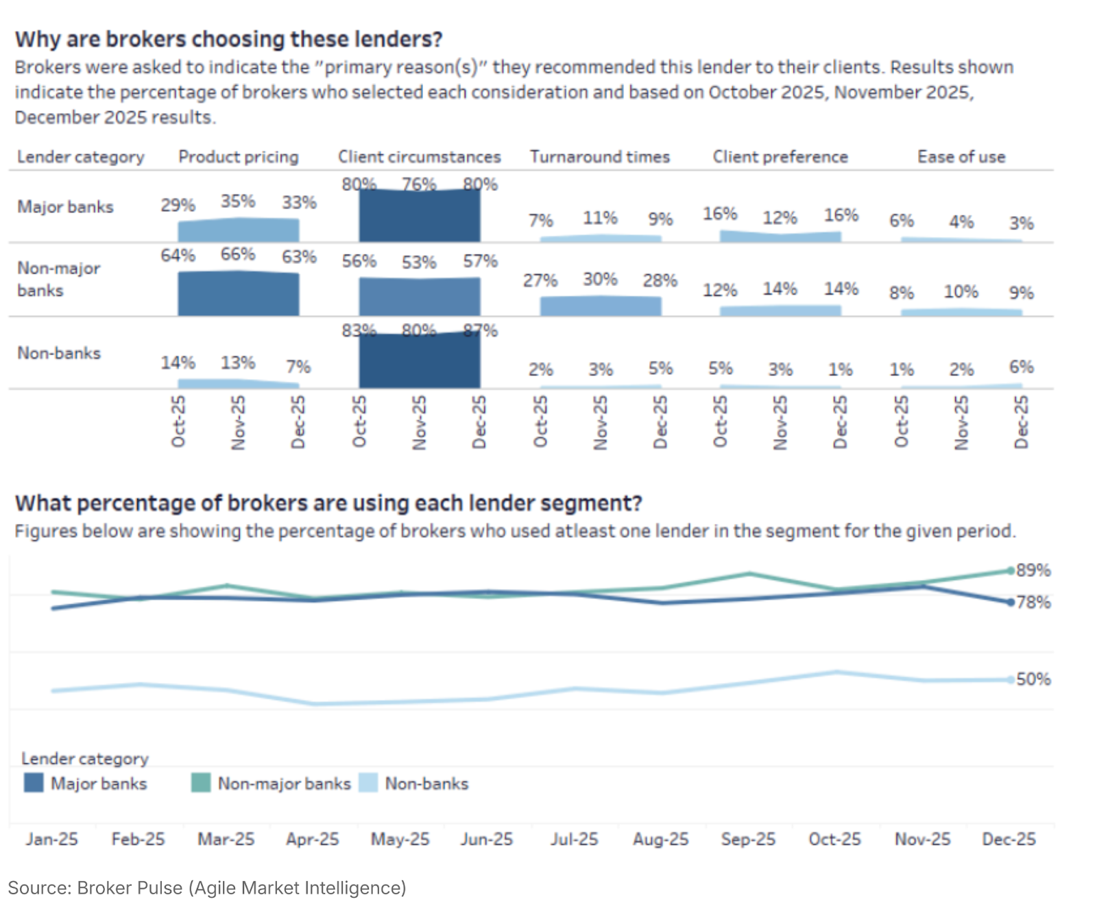 Non-majors outpace the other lender types in terms of product pricing, indicating that the cost of their products is significantly competitive compared to the rest. In a similar vein, for non-banks brokers have a greater preference in fitting products to the clients’ circumstances, which may be attributable to the flexible nature of these types of lenders.