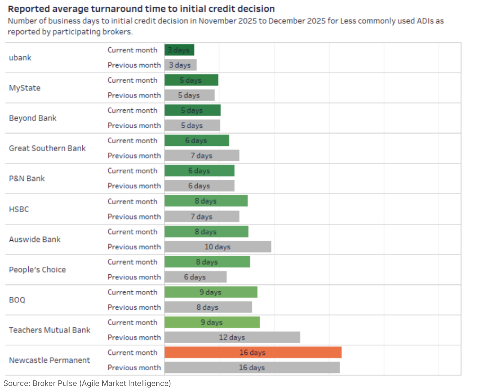 In the small ADIs category, uBank continues to have the fastest turnaround time of 2.7 business days. MyState and Beyond Bank follow with turnaround times of 5 and 5.1 days, respectively. Rounding out at fourth place is Great Southern Bank, with a process time of up to 5.1 business days. Interestingly, this lender is one of the few to have quickened their overall turnaround times. Another bank with a similar achievement was Teachers Mutual Bank, having a turnaround time of 8.7 days in December, when the lender previously took up to 12 business days in the past.