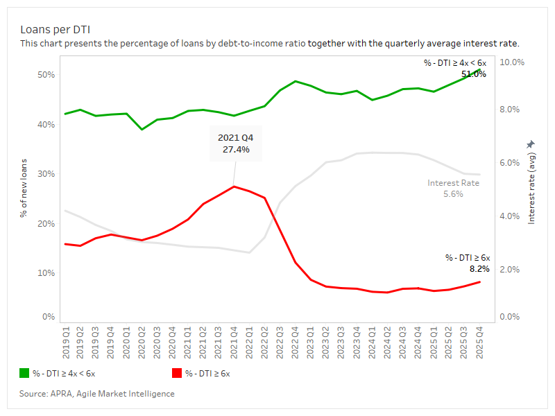 Statistics in this article were drawn by Agile Market Intelligence from APRA’s quarterly ADI property exposure statistics (December 2025). The dataset covers property loans across authorised deposit-taking institutions, particularly loan-to-value statistics for owner-occupied and investment housing loans. Agile has plotted the loans per DTI together with the going average interest rate to show the proportion of high-risk loans.